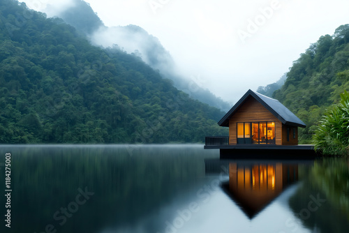 wooden house on serene lake surrounded by lush mountains, reflecting in calm water. misty atmosphere adds tranquil and peaceful vibe to scene