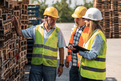 men at work, supervisor, quality, product, number, pallet, people, hard hat, warehouse, senior, female, male, production, standard, inspection, team, walk, review, management, yard, discussion, quality control, process, evaluation, industry, supervision, factory, collaboration, assessment, manufacturing, oversight, logistic, monitoring, compliance, verification, craftsmanship, productivity, organisation, teamwork, efficiency, mid-age, helmet