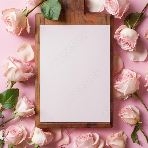 wooden menu holder, a blank page, menu mockup, many rose flowers in the background, cute, kawaii, valentines day background