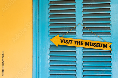 museum, signs, turquoise, culture, history, landmark, education, tour tourism, visit, information, symbol, historical, letter, travel, lettering, banner, billboard, board, direction, guidepost, hanging, notice, object, signs, post, signal, street, way, art, exterior, entrance, architecture, holiday maker, educational, academic, cultural, historic, house, yellow, blue, public, science, wooden