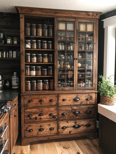 pantry, wood, jar, kitchen, organisation, shelf, glasses, drawer, ingredient, cooking, rustic, storage, cabinet, food, spice, grain, bean, lentil, herb, countertop, interior, home, domestic, vintage, design, house, light, window, plant