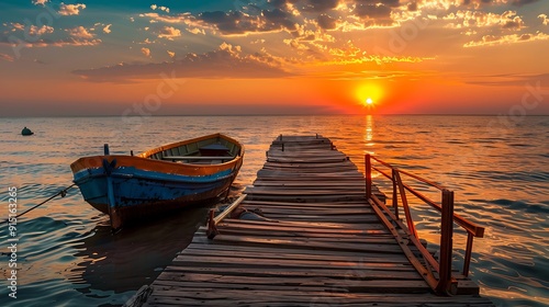 Wooden pier with boat at sunset