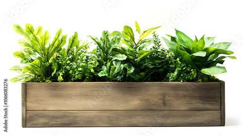 Wooden planter box with lush green plants on white background