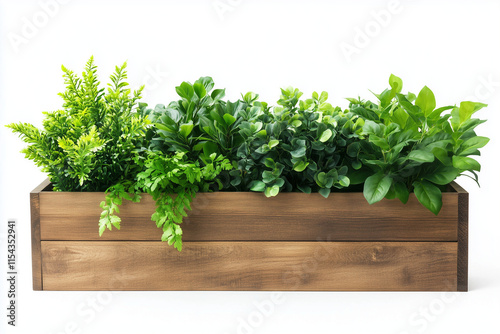 Wooden Planter with Green Plants on White Background for Minimalist and Rustic Indoor Decor