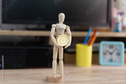 Wooden puppet holding bitcoin on the computer table