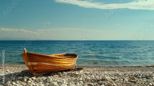 Wooden rowboat on pebble beach peaceful seascape summer vacation