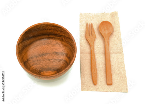 wooden spoon and fork put on recycle brown napkin prepare for serve. Isolated on white background