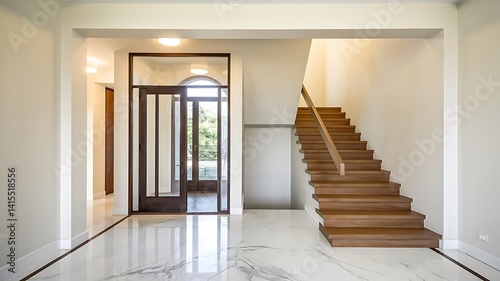 Wooden staircase and marble floor in minimalist interior design of modern entrance hall with door. home interior design.