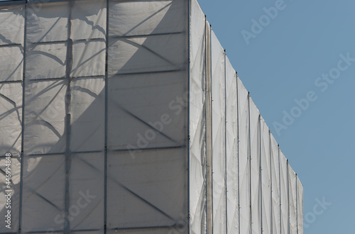wooden structure covered with white synthetic material tarpaulin - sunlight reflection, summer, late afternoon