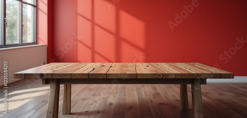 wood, table, red, wall, sunlight, shadow, window, room, interior, design, rustic, wooden, plank, grain, light, texture, surface, home, decor, furniture, style, modern, minimalist, simple, clean, line, space, empty, background, display, product, showcase, photo, aesthetic, bright, warm, cosy, hardwood, floor, board