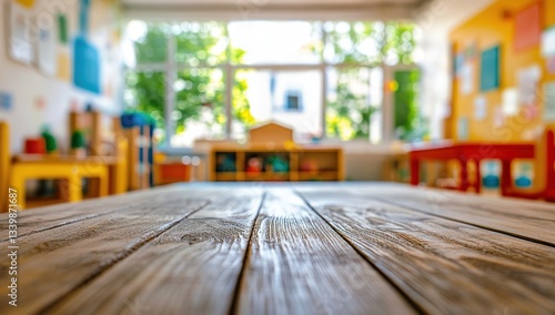 Wooden Table in Bright Classroom Shows Early Childhood Education, Learning Environment, Childcare Center, Preschool Furniture