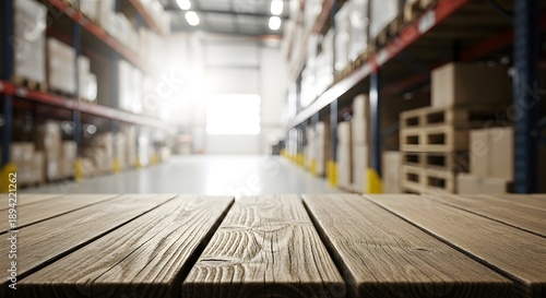 wooden table, foreground, background, blurred, warehouse, shelf, box, storage, logistic, distribution, industrial, interior, empty, clean, bright, daylight, pallet, good, inventory, aisle, freight, shipping, receiving, product, merchandise, cargo, wood texture, empty space, copy space, retail, wholesale