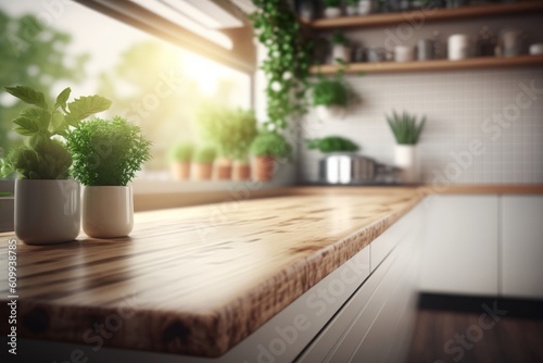 Wooden table top on blur kitchen room background, Modern Contemporary kitchen room interior with green plants, Generative ai