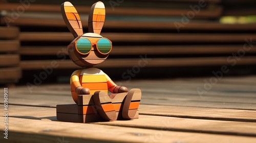 Wooden toy rabbit in sunglasses. Animal figurine made of planks. Illustration for cover, card, postcard, interior design, decor or print.