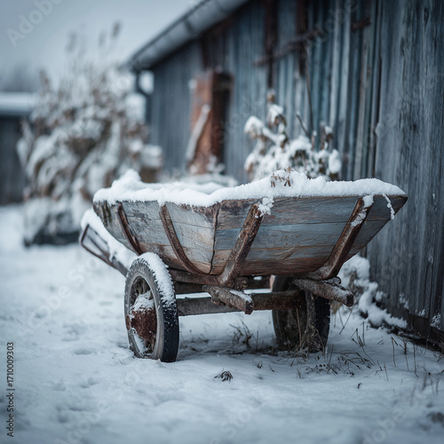 Wooden wheelbarrow covered with snow. Rural winter farming concept for countryside, agriculture, and seasonal themes.