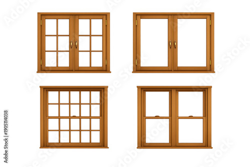 Wooden windows set showing different styles with natural brown frames and glass, on a transparent background