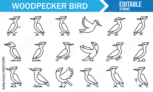 woodpecker, bird, avian, wildlife, animal, nature, forest, beak, wing, tail, flying, perched, pecking, tree, fauna, icon, icon, set, collection, outline, minimal, simple, editable, vector, silhouette, symbol, pictogram, logotype, vignetting, drawing, black, white, isolated, design, graphic, illustration