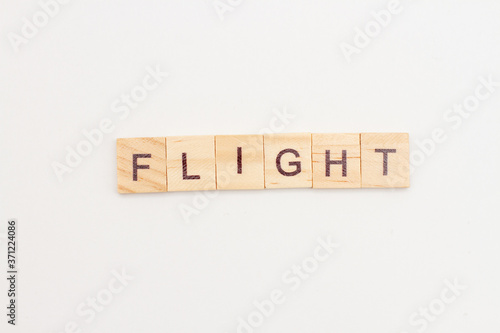 Word FLIGHT made from wooden cubes on white.