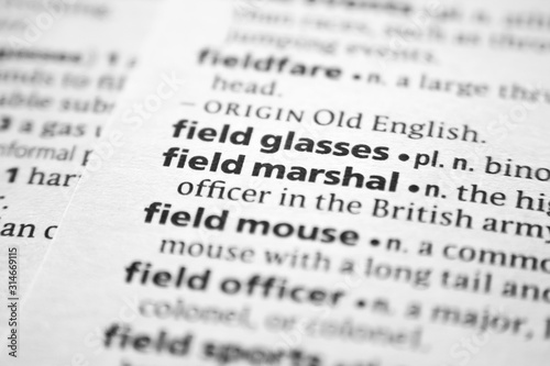 field, marshal, definition, meaning, dictionary, word, highlighted, text, concept, conceptual, white, black, paper, page, magnifying, glasses, editorial, illustrative