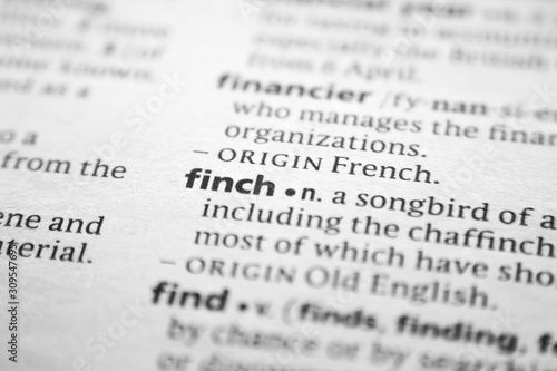 finch, definition, meaning, dictionary, word, highlighted, text, concept, conceptual, white, black, paper, page, magnifying, glasses, editorial, illustrative