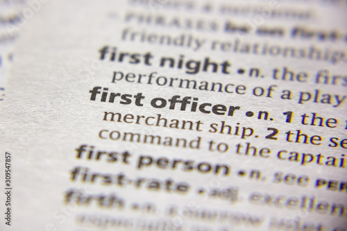 first, officer, definition, meaning, dictionary, cyclopaedia, word, highlighted, text, concept, conceptual, white, black, paper, page, magnifying, glasses, editorial, illustrative