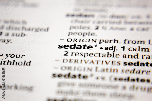 sedate, definition, dictionary, word, highlighted, marker, text, concept, conceptual, white, black, paper, page, magnifying, glasses, editorial, illustrative