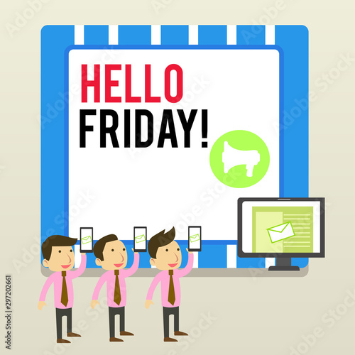 Word writing text Hello Friday. Business photo showcasing used to express happiness from beginning of fresh week SMS Email Marketing Media Audience Attraction Personal Computer Loudspeaker