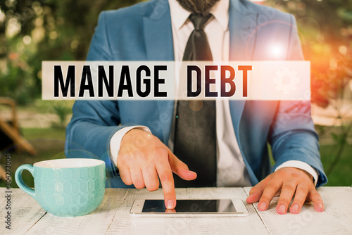 Word writing text Manage Debt. Business photo showcasing unofficial agreement with unsecured creditors for repayment Businessman with pointing finger in front of him