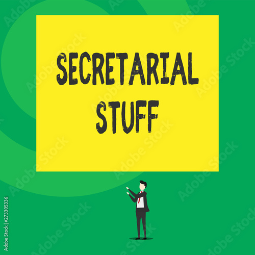 Word writing text Secretarial Stuff. Business concept for Secretary belongings Things owned by demonstratingal assistant Isolated view young man standing pointing upwards two hands big rectangle.