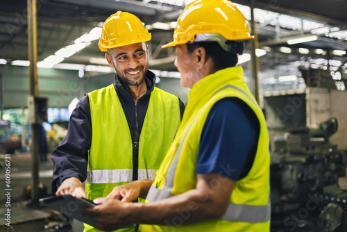 worker and engineer using tablet computer for inspection and checking production process on factory station