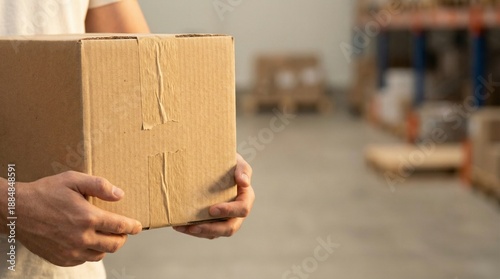 Worker in a large warehouse holding a cardboard shipping box with organized shelves and pallets in the background, depicting logistics, packaging, and inventory handling operations