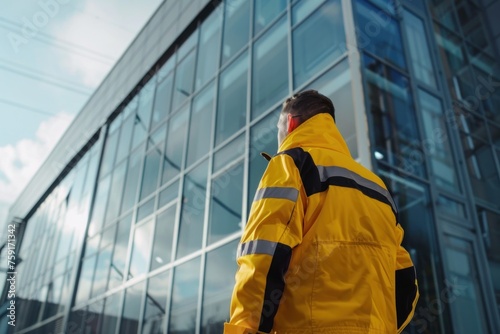 worker in a yellow jacket is looking at the building