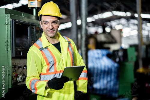 Worker man caucasian happy smiling in protective safety jumpsuit uniform with yellow hardhat and using tablet at factory.Metal working industry concept professional engineer manufacturing machine