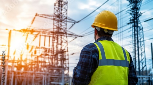 men at work, maintenance, dusk, sunset, light, silhouette, power, line, view, dramatic, safety, helmet, vest, electrical, infrastructure, technician, industry, energy, utility, scene, landscape, observation, equipment, sky, horizon, technology, job, professional, standing, nature, employee, construction, evening, background, grid, inspection, field, environment, work, labor, responsibility