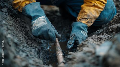 men at work, glove, pipe, repair, mud, underground, construction, maintenance, plumbing, industrial, dirty, tool, job, hard work