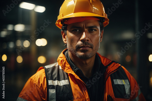 Worker wearing a construction hat and a reflective orange and yellow vest. Generative AI.