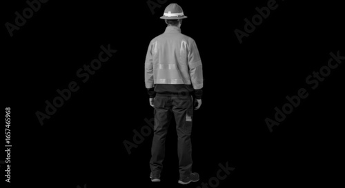 Worker wearing high visibility orange and blue safety jacket, dark pants, and hardhat, isolated on transparent background