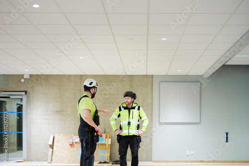 building site, men at work, construction, construction worker, construction industry, construction site, housing development, build, adult, man, man, people, hard hat, helmet, communication, colleague, engineer, horizontal, indoor, day, looking away, standing, two people, real people, together, togetherness, conversation, talking, discussion, lifestyle, colours, installation