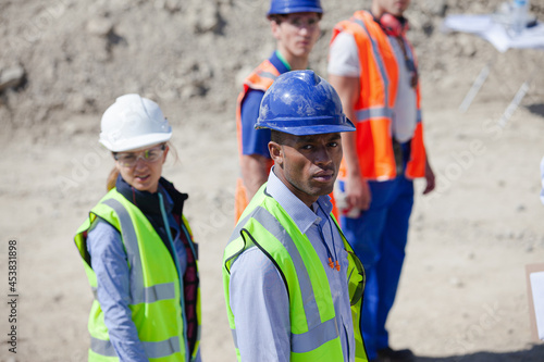 men at work, talk, machinery, quarry, adult, blue, clear, construction, copy space, co-worker, day, enormous, equipment, full-length, hard, hat, heavy, jacket, man, mature, mid, outdoors, people, protection, backview, reflective, safety, scale, site, sky, racked, sunny, three, vest, view, work, young