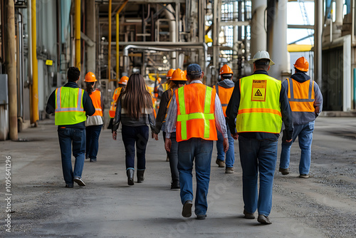 Workers wearing high-visibility vests participating in an emergency evacuation drill at an industrial plant, emphasizing safety protocols and teamwork in risk preparedness.
