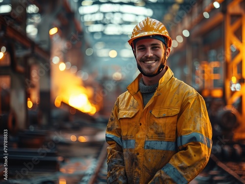 portrait, factory, photo, people, waist up, metal industry, steel mill, indoor, occupation, front view, adults only, expertise, hard hat, horizontal, color image, industry, adult, confidence, standing, protection, headwear, man, pride, safety, skill, working, engineer, steel, arms crossed, copy space, business, day, smiling, holding, mature adult, manufacturing, satisfaction, industrial building, helmet, machinery
