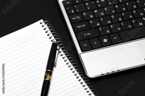 Workplace with notepad and laptop on black