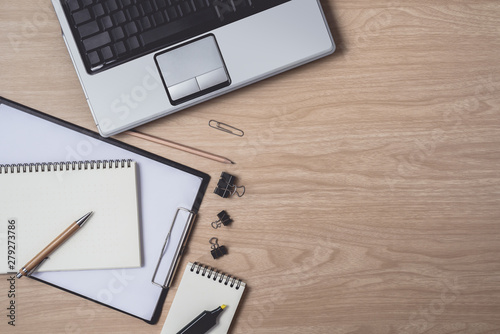 Workspace with diary or notebook and laptop, pen, pencil, hightlight pen, metal clip on wooden background