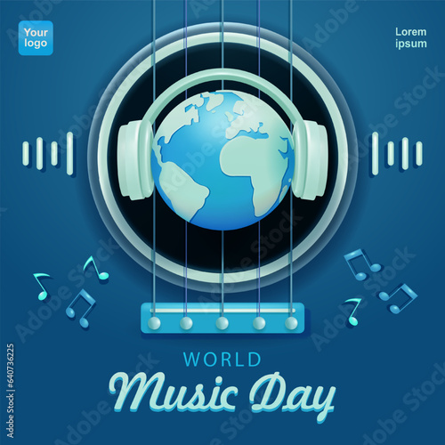 World Music Day. Miniature earth using headphones with guitar background, 3d vector. Suitable for music events