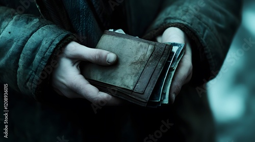 billfold, hand, worn, old, leather, poor, poverty, memory, photograph, picture, image, money, cash, bill, note, currency, coin, financial, struggle, destitute, needy, homeless, sad, gloomy, dark, shadow, cold, winter, outdoors, person, human, grimy, dirty, soiled, texture, detail, closeup, fragile, holding, precious
