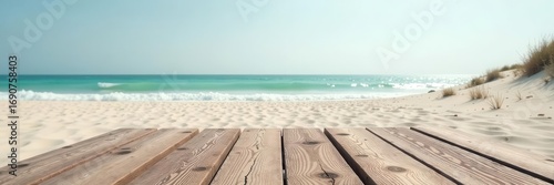 Worn wooden planks lead to sandy beach Grey sky , solitary, vintage