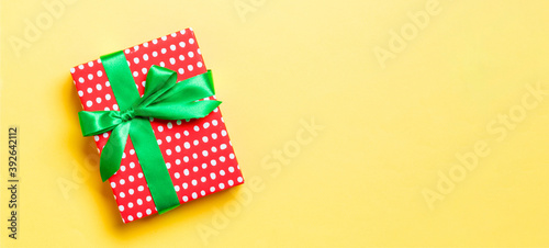 wrapped Christmas or other holiday handmade present in paper with green ribbon on yellow background. Present box, decoration of gift on colored table, top view with copy space
