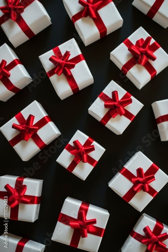 Wrapped gift boxes with red ribbons arranged on a dark surface