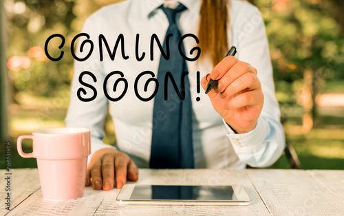 Writing note showing Coming Soon. Business concept for event or action that will happen after really short time Female business person sitting by table and holding mobile phone