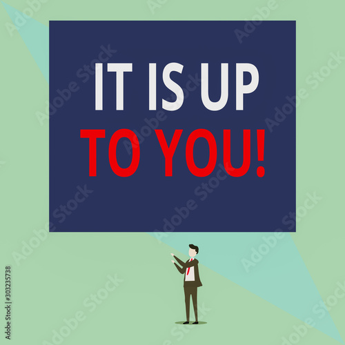 Writing note showing It Is Up To You. Business concept for Used to tell a demonstrating that they are the one to decide Isolated view man standing pointing upwards two hands big rectangle